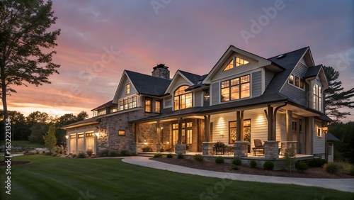 Beautiful modern farmhouse style luxury home exterior at twilight