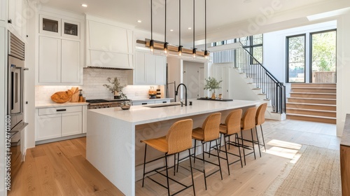 kitchen, island, cabinet, countertop, chair, stool, modern, design, interior, architecture, lighting, wood, floor, stair, railing, window, view, white, open, home, living, space, contemporary, light, bright, plant, decor, minimalist, style, backsplash, appliance, oven, sink, faucet, handle, hardware, texture, pattern, clean, smooth, rectangular, arrangement, composition, pendant, luxury, elegant, upscale, neutral