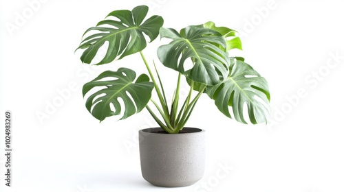 Beautiful Monstera deliciosa with large, glossy leaves, placed in a gray pot, isolated on a white background, creating a fresh, modern look