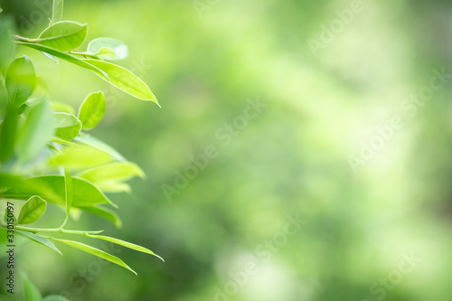 Beautiful nature view of green leaf on blurred greenery background in garden and sunlight with copy space using as background natural green plants landscape, ecology, fresh wallpaper concept.