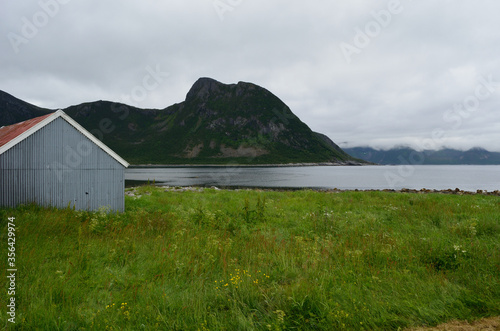 beautiful old fishing boat houses next to summer fjord with mountain background