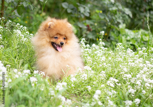 Beautiful orange dog - pomeranian Spitz. Puppy pomeranian dog cute pet happy smile playing in nature on in flowers