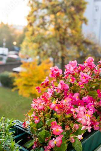 Beautiful pink begonia in Autumn outdoors. Gardening concept. Autumn season. Natural background