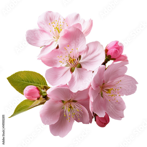 Beautiful Pink Cherry Blossoms in Full Bloom with Buds and Green Leaves on transparent background