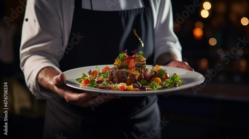 beautiful plate of food served in restaurant, gourmet, waiter food service, dinner, lunch
