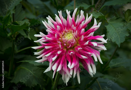 Beautiful purple pink and white colored dahlia flower in a green natural environment