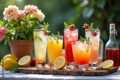 Beautiful row line of different colored cocktails on a party. Decorated catering bouquet table on open air event, picture with beautiful bokeh. AI