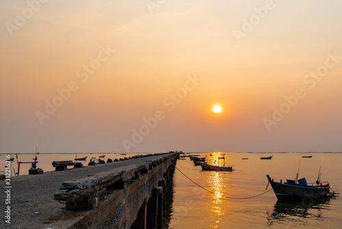 Beautiful seascape sunset with silhouette fishing wood boat floating down on sea at jetty in asia