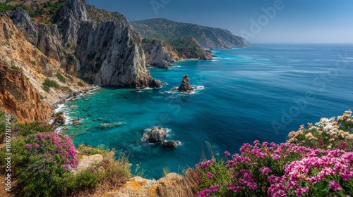 Beautiful seascape with mountains, flowers, and a blue sky