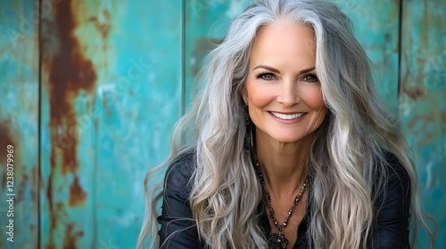 grey hair, natural beauty, mature woman, skincare, green background, clear details, wellness, healthy lifestyle, laughter