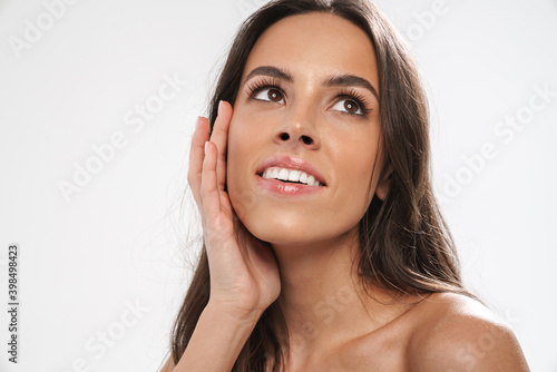 Beautiful shirtless happy girl smiling and looking upward