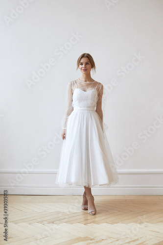 Beautiful slender woman in white wedding dress, new collection of dresses for the bride. Noise, out of focus