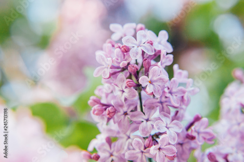 Beautiful smell violet purple lilac blossom flowers in spring time. Close-up blossom twigs of lilac. Inspirational natural floral spring blooming garden or park. Colorful ecology nature landscape