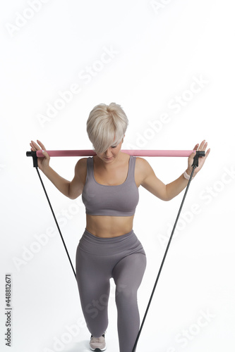 exercise, fitness, healthy, sport, woman, physical exercise, beautiful, female, fit, person, body, training, blond, sporty, isolated, background, girl, health, lifestyle, care, active, adult, blond, gym, stretch, white, athlete, face, smile, model, attractive, trust, pink, gymnastics, athletic, pretty, activewear, studio, smart, tracker, watch, copy space, sexy, smiling, sling, equipment, push