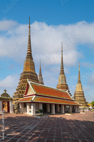 Beautiful stupas decorated with colorful mosaic big pagoda and Thai art architecture of Wat Pho temple in Bangkok, Thailand.