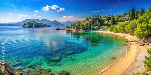 Beautiful summer vacation landscape in Corfu, Greece with a serene sea and sandy beach , Greece, Corfu, vacation, landscape
