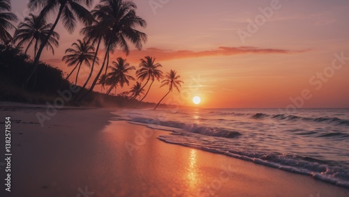 Beautiful sunset above the ocean on the beach featuring palm trees and a vibrant sky for travel and vacation.