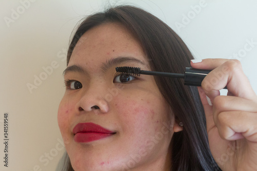 Beautiful teenage Asian applying eye make-up