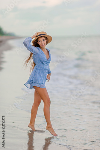 Beautiful teenager girl on tropical seashore at sunset. Beautiful little girl in dress at beach having fun. Happy girl enjoy summer vacation background the blue sky and turquoise water in the sea