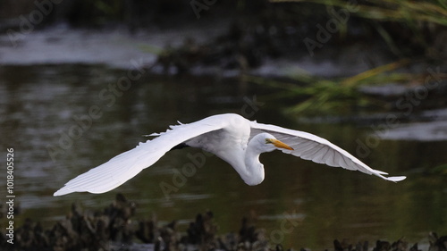 Beautiful white egret bird in flight in saltwater marsh reeds