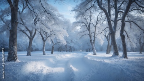 Beautiful winter forest in the park showcasing snowy scenery and natural background.