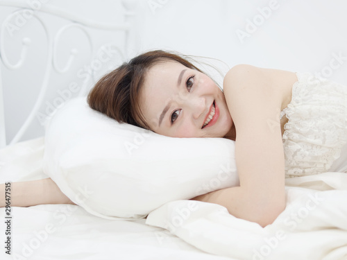 smile, happy, bed, girl, awake, looking, home, arm, positive, pleasure, pajama, background, body, closeup, hair, sexy, comfortable, people, rest, cheerful, face, lifestyle, beauty, adult, attractive, white, japanese, korean, asian, chinese, nightdress, cute, toothy, relax, bedtime, portrait, relaxation, pretty, sleep, indoor, pillow, woman, lying, person, morning, young, bedchamber, female, beautiful