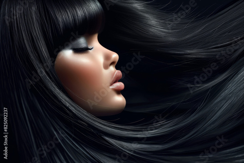Beautiful woman with straight long shiny black hair. Beauty and hair care concept