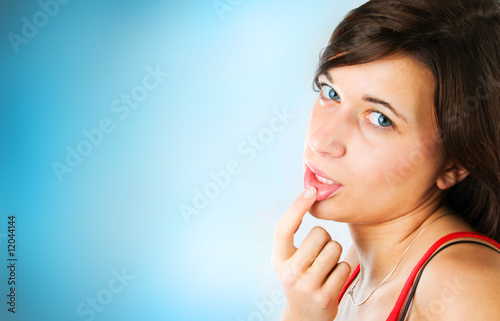 woman, face, young, spa, care, health, beauty, lifestyle, sexy, adult, attractive, background, beautiful, space, brown, brunette, colourful, copy space, healthy, body, skin, fashion, female, empty, girl, expression, hair, head, casual attire, lady, lip, model, modern, finger, person, portrait, pretty, sensuality, complexion, wellness, blue, eye, love, valentine, well, being, well-being, touching, touch, tempting