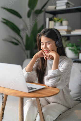 Beautiful young asian woman in casual clothing using laptop and smiling while work from home