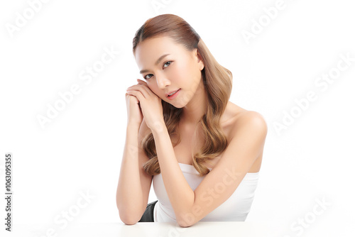 Beautiful young asian woman with clean fresh skin on white background, Face care, Facial treatment, Cosmetology, beauty and spa, Asian women portrait.