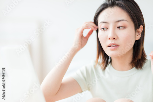 woman, chinese, asian, young, home, skincare, beauty, maintenance, mirror, day cream, night cream, home, smile, smiling, japanese, korean, 20, 30, portrait, single, person, 1, beautiful, elegant, lovely, short hair, black hair, happy, bed, white, people, cheerful, face, cute, phone, brunette, lying