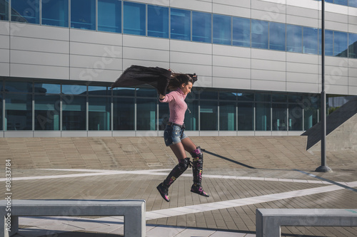 Beautiful young brunette jumping in the city streets