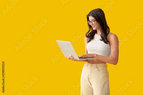 Beautiful young happy woman working with laptop on yellow background
