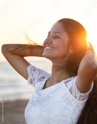teenage, woman, beach, sea, white dress, girl, person, 1, people, summer, sunset, sunny, sun, orange, backlight, reflections, long hair, dark skin, caucasian, young, lifestyle, spontaneous, modern, lace, sand, ocean, portrait, smile, smiling, happy, happiness, tan, tanning