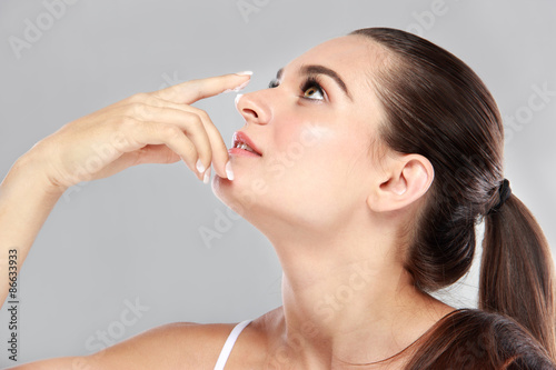 summing, adding, adult, applying, attractive, background, beautiful, beauty, care, caucasian, clean, closeup, closeup, concept, cosmetic, cream, cute, elegance, face, female, girl, gorgeous, isolated, lady, looking, make-up, model, moisturiser, natural, nose, person, portrait, pose, pretty, half face, skin, skincare, studio, treatment, woman, young