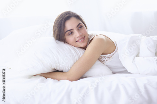 beautiful young woman basking in bed in the morning. Beautiful