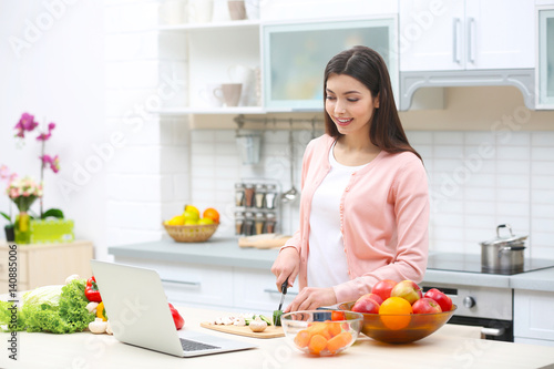 apple, beautiful, board, bowl, carrot, caucasian, clothes, computer, cook, cooking, counter, cucumber, culinary, cut, cutting, design, equipment, female, food, fruit, furniture, girl, healthy, home, homemade, homeowner, housekeeper, ingredient, interior, kitchen, knife, laptop, lettuce, mushroom, notebook, orange, person, preparation, product, receipe, slice, sweet pepper, table, tasty, vitamin, woman, wooden, young
