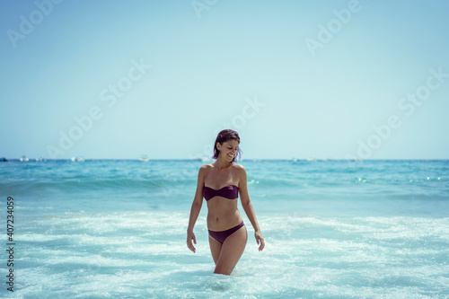 Beautiful young woman in bikini on vacation swimming in sea and enjoying in sand beach. Happy female enjoying summer time holiday on beach.