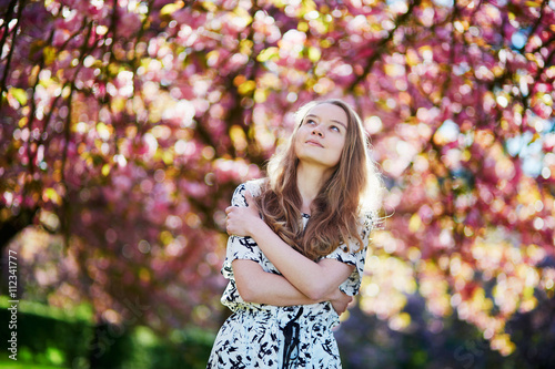 human, female, person, people, woman, girl, white, caucasian, european, young, adult, blond, long hair, happy, positive, nature, natural, park, garden, outdoors, spring, springtime, season, seasonal, tree, flower, cherry blossom, hanami, sakura, cherry, sunlight, countryside, bloom, flowering, beautiful, pollen, allergy