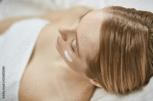 woman, young, salon, cosmetic, beauty, girl, spa, therapy, treatment, skin, care, face, beautiful, lying, natural, relax, facial, cosmetician, portrait, complexion, hand, health, healthy, massage, pure, skincare, well-being, wellness, cream, mask, brush, cleaning, clear, health care, hygiene, moisturise, white, body, pretty, female, beautician, caucasian, closeup, peel, pamper, applying, background, bandage, closeup, essential