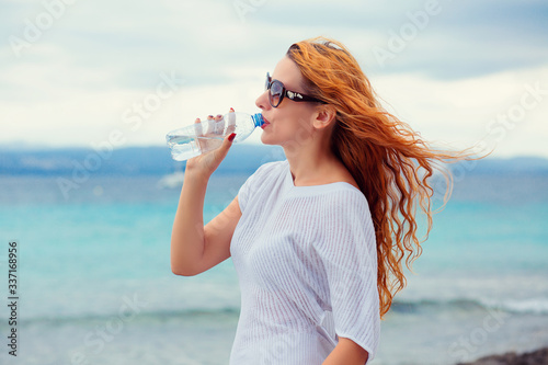 beautiful young woman in sunglasses drinking water in summer beach outdoor with sea background