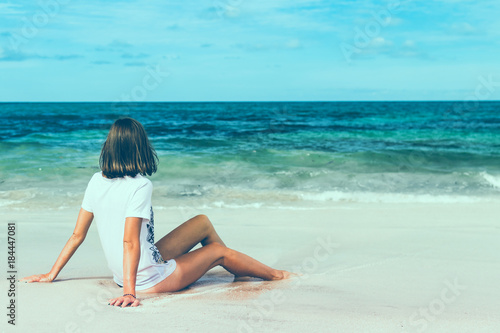 Beautiful young woman posing on the beach of a tropical island of Bali, Indonesia.