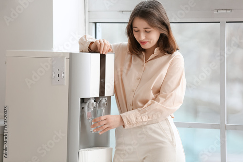 Beautiful young woman pouring water from cooler into glass in kitchen