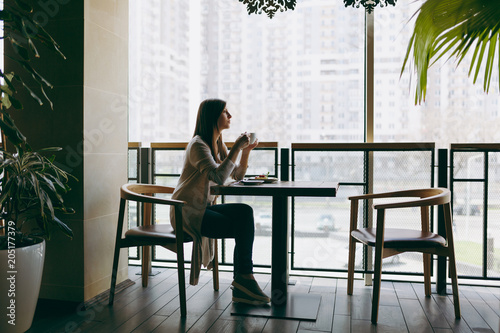 Beautiful young woman sitting alone near big window in coffee shop at table with cup of cappuccino, cake, relaxing in restaurant during free time. Young female having rest in cafe. Lifestyle concept.