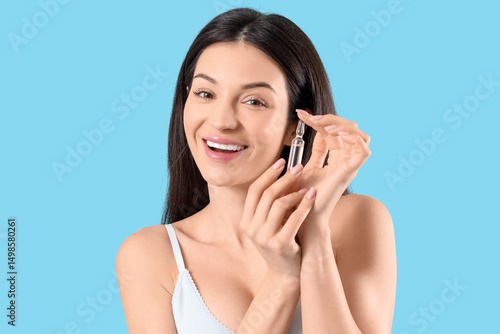 Beautiful young woman with ampoule on blue background, closeup