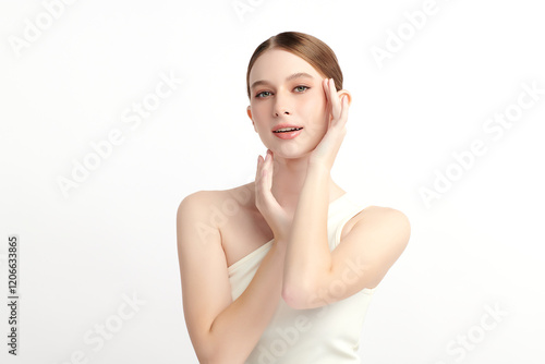 Beautiful young woman with clean fresh skin on white background, Face care, Facial treatment, Cosmetology, beauty and spa, women portrait.