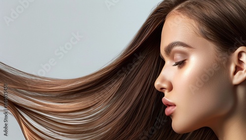 beautiful, young, woman, long, healthy, brown, hair, banner, hairdresser, coiffure, girl, lady, shiny, dark, face, pretty, beauty, model, fashion, eye, closeup, skin, people, looking, glamour, person, closeup, natural, studio, smiling, head, teenage, 1, lip