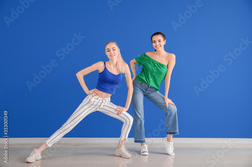 Beautiful young women dancing against color wall