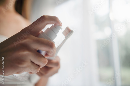 beauty at home concept, finger pressing toothpaste to toothbrush.