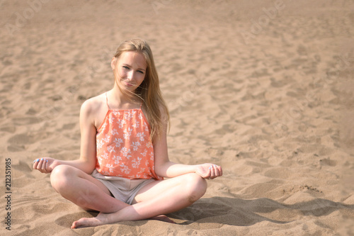 beauty girl sitting on sand. happy relax